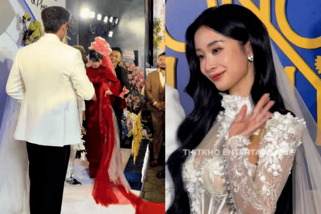 Đứng cạnh cô là chú rể diện suit trắng lịch lãm, ngoại hình sáng, chiều cao nổi bật. Cả hai sánh đôi tạo nên tổng thể hài hòa, được nhận xét xứng đôi vừa lứa. Đáng chú ý, phía sau sân khấu còn xuất hiện bảng tên "Đình Khoái & Phương Anh" - trong đó Phương Anh chính là tên thật của Jun Vũ, càng khiến nhiều người tin rằng nữ diễn viên đã bí mật lên xe hoa.