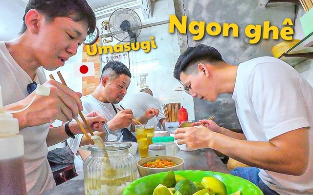 Ngoài cảnh đẹp, bạn bè quốc tế còn có những ấn tượng mạnh với ẩm thực của Việt Nam. Là người Nhật sinh sống tại Việt Nam, tài khoản YouTube PAPAKEN-family Cuộc sống ở Việt Nam thường chia sẻ những trải nghiệm thưởng thức các món ăn Việt. Trong series về Hà Nội, anh cùng 2 người bạn Nhật Bản đã ghi lại khoảnh khắc thưởng thức món phở tại quán ông Vui có địa chỉ tại phố Hàng Giày.