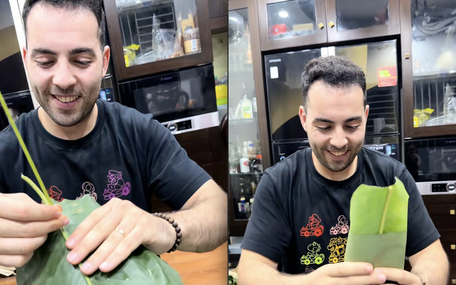 Thay vì chỉ đứng xem hay chụp ảnh, Hamza thực sự "nhập cuộc". Anh cùng mọi người chuẩn bị lá dong, vo gạo nếp, ướp thịt, đãi đỗ xanh rồi tỉ mỉ gói từng chiếc bánh vuông vức. Nhưng điều khiến anh nhớ nhất không chỉ là công đoạn gói bánh, mà là khoảng thời gian chờ đợi sau đó.