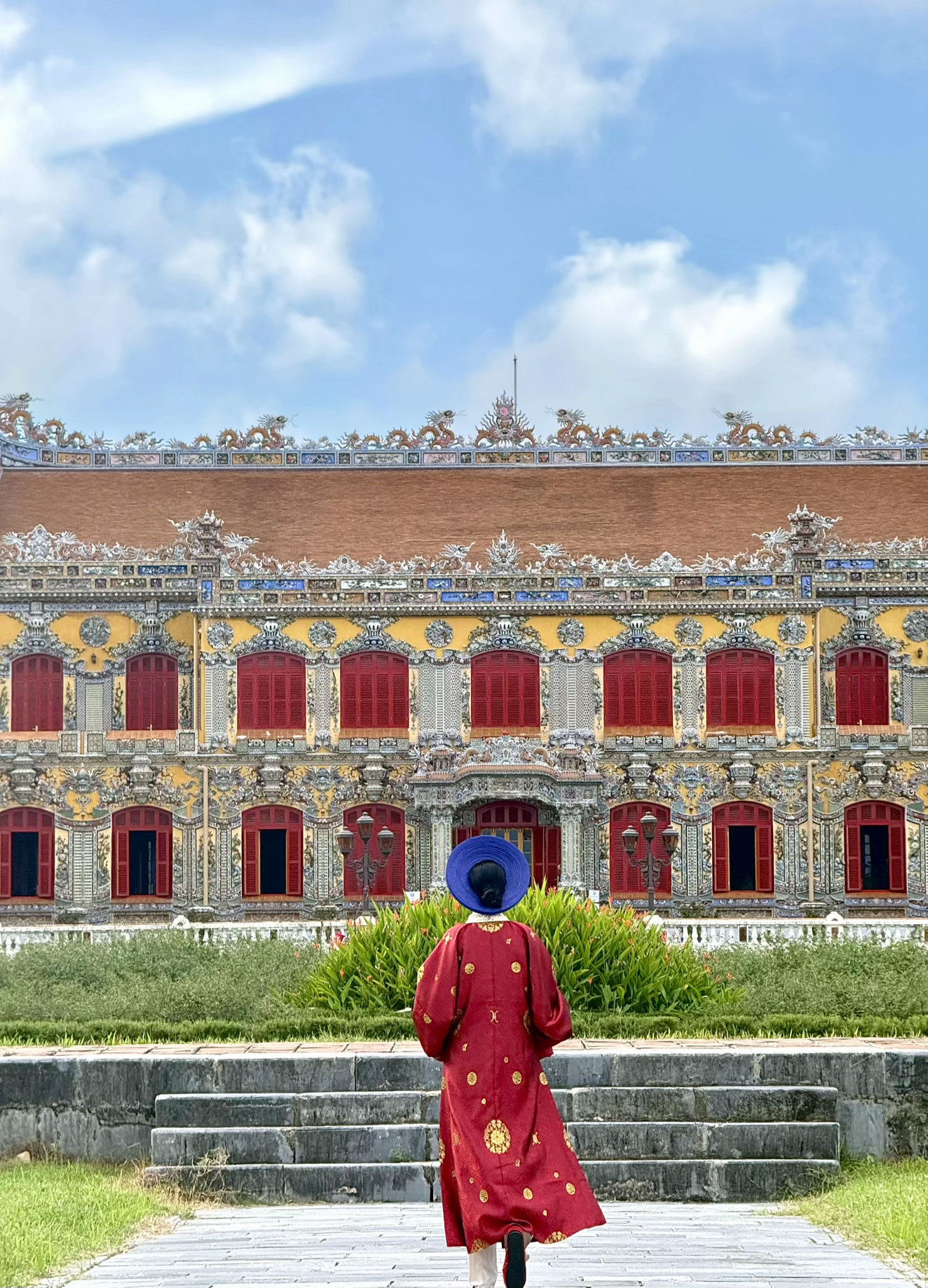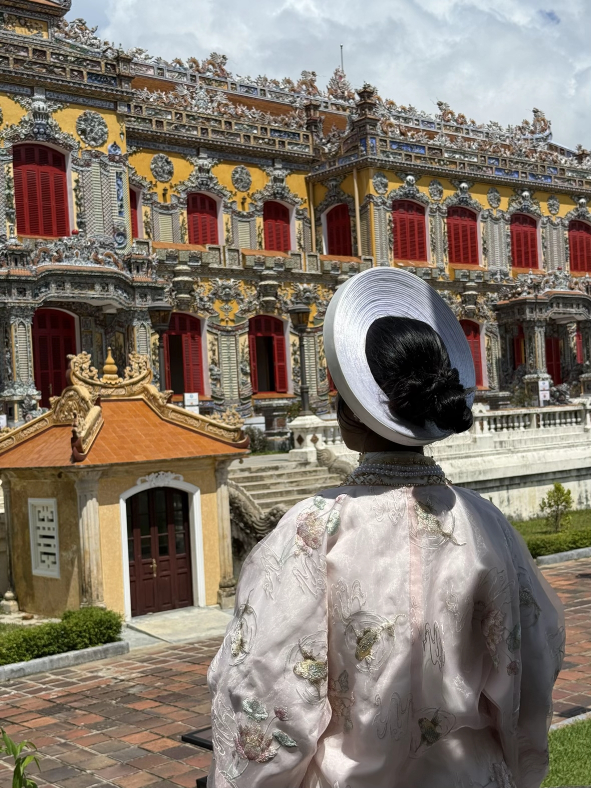 Trong khung hình, phía trước là một khoảng sân rộng, nơi từng nhóm người đang di chuyển chậm rãi. Điều đặc biệt nằm ở chỗ gần như tất cả đều mặc cổ phục. Người thì áo dài ngũ thân, người diện nhật bình, có người còn đội khăn đóng, cầm quạt,... Không gian xung quanh là cung điện cổ kính, mái ngói vàng, tường đỏ, tất cả hòa vào nhau tạo thành một bức tranh mà nếu không để ý, rất dễ nghĩ đó là… một cảnh quay phim cổ trang.