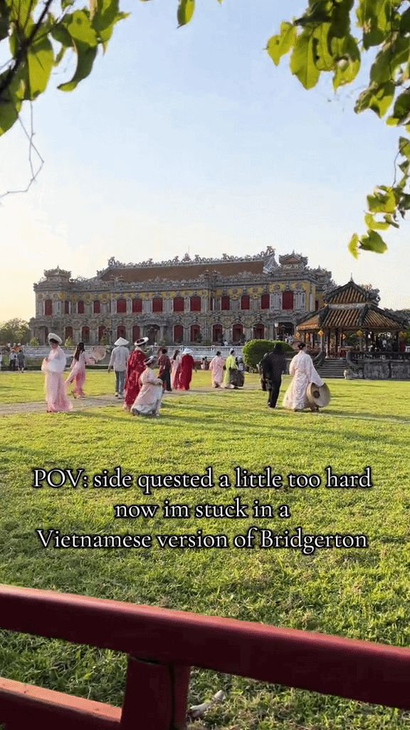 Mới đây, một đoạn video ngắn của du khách nước ngoài với dòng caption: “POV: Mải làm nhiệm vụ phụ quá nên giờ bị kẹt luôn trong một phiên bản Việt Nam của Bridgerton” đang khiến mạng xã hội bật cười vì sự hài hước, thú vị. Bởi khung cảnh trong đoạn clip mà vị khách Tây này đang nhắc đến là Đại Nội Huế.