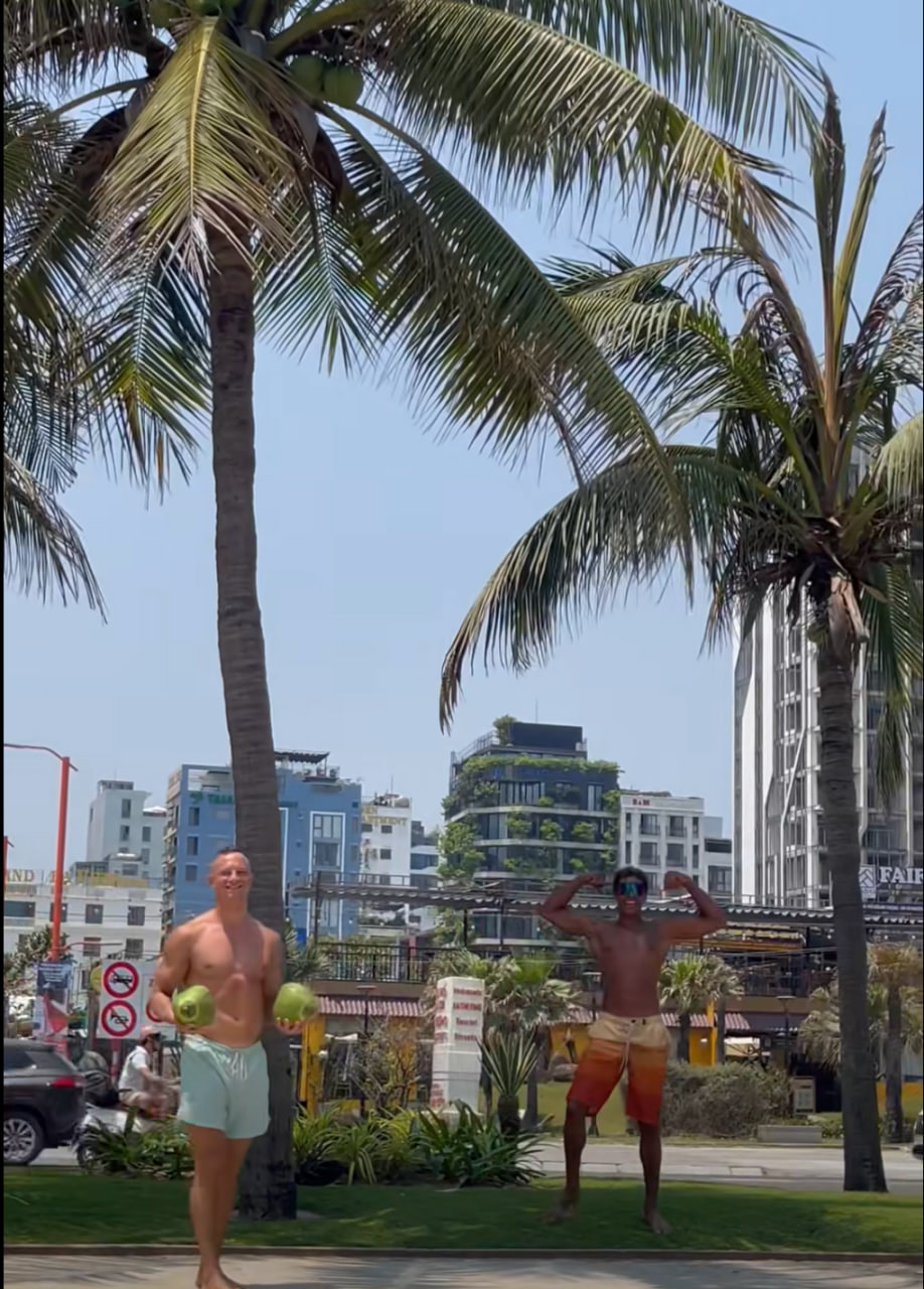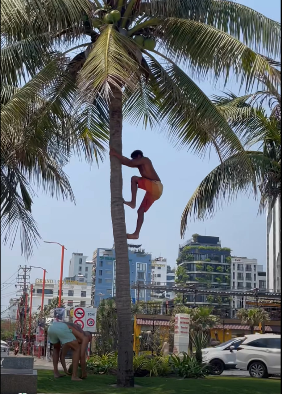 Cứ ngỡ anh chàng Tây sẽ bỏ qua lời nói đùa, nhưng phản ứng tiếp theo của nam du khách mới là thứ khiến cõi mạng bùng nổ. Không nói nhiều, anh chàng lập tức lao tới cây dừa cao vút ngay sát vỉa hè. Bằng sự dẻo dai và những động tác bám trụ cực kỳ chuyên nghiệp, nam du khách thoăn thoắt trèo lên ngọn cây trong sự ngỡ ngàng của chính người đưa ra lời “thách thức” kia.