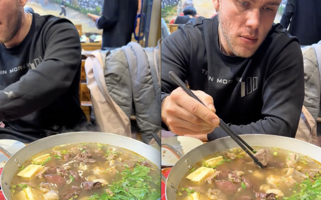 Theo đoạn clip được chia sẻ trên mạng xã hội, vị khách Tây trong chuyến du lịch Việt Nam đã quyết định gọi món thắng cố để thử cho biết. Ban đầu, anh có phần dè dặt khi nhìn nồi thắng cố nghi ngút khói với đủ loại nguyên liệu bên trong. Nhưng sau vài giây quan sát, vị khách vẫn cầm thìa lên nếm thử, rồi tiếp tục ăn thêm vài miếng nữa.