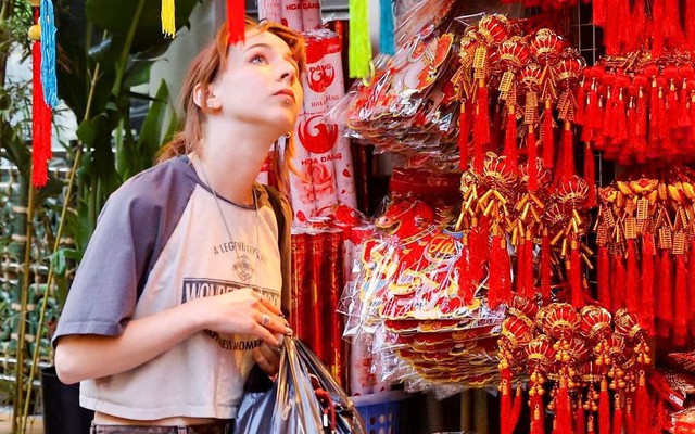 Du khách nước ngoài thích thú dạo phố, chụp ảnh và mua đồ trang trí Tết tại phố Hàng Mã.