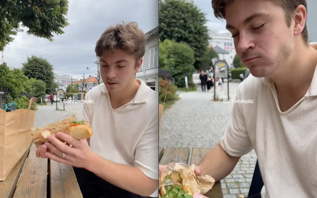 Trong đoạn clip lan truyền trên mạng, người đàn ông Tây ngồi bên chiếc bàn nhỏ ven đường, trước mặt là ổ bánh mì vàng ruộm. Anh cẩn thận cầm lên, cắn từng miếng nhỏ, mắt lim dim như để cảm nhận trọn vẹn hương vị. Đặc biệt, khi một cọng rau mùi như sắp rơi ra khỏi chiếc bánh, anh không hề bỏ qua mà nhanh chóng đưa lên miệng thưởng thức một cách trân trọng.