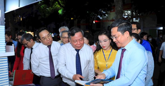Phó Bí thư Thường trực Thành ủy Hà Nội Nguyễn Văn Phong cùng các đại biểu tham quan gian trưng bày sách tại lễ hội. Ảnh: Quang Thái