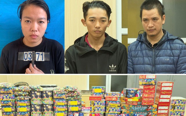 Các đối tượng: Nguyễn Thị Cẩm Nhung, Lê Hữu Khiêm và Vũ Trường Giang (từ trái sang phải)cùng hơn 500kg pháo thu giữ - Ảnh: Công an Thanh Hoá