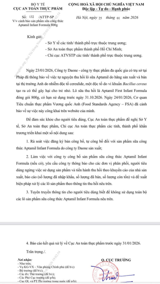 Ngày 25/01/2026, TS Chu Quốc Thịnh, Quyền Cục trưởng Cục An toàn thực phẩm (Bộ Y tế) ban hành Công văn số 132/ATTP-SP gửi Sở Y tế các tỉnh/ thành phố trực thuộc trung ương; Sở An toàn thực phẩm thành phố Hồ Chí Minh; Chi cục ATVSTP các tỉnh/ thành phố trực thuộc trung ương về việc cảnh báo sản phẩm sữa công thức Aptamil Infant Formula 800g.