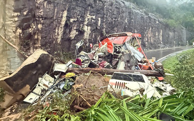 Hiện trường vụ sạt lở đè trúng xe khách trên đèo Khánh Lê vào