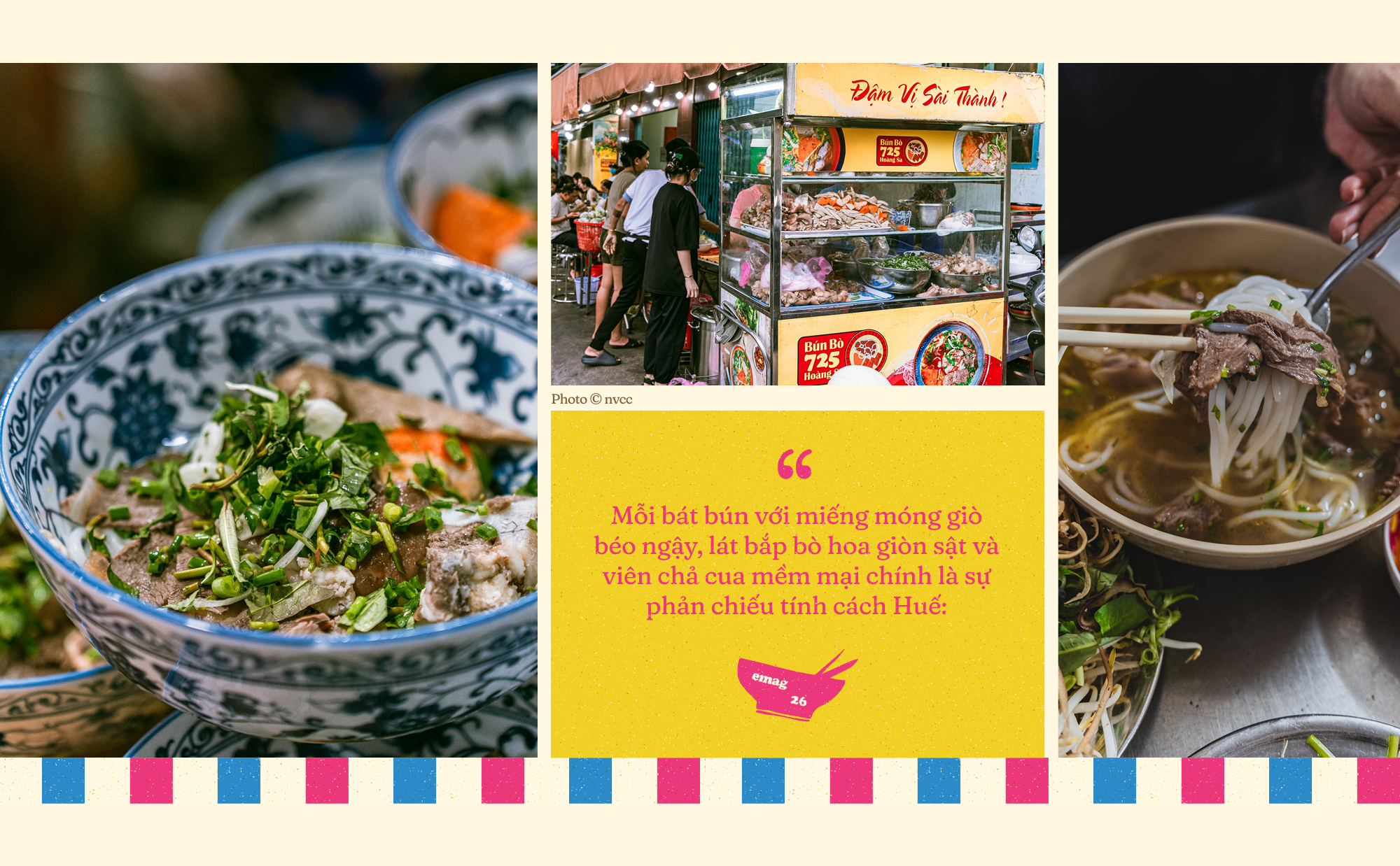 Nước dùng bún bò là sự "đối kháng" thú vị giữa mùi mắm ruốc nồng nàn và hương sả thơm ngát, được phủ lên một lớp váng dầu màu điều rực rỡ. Mỗi bát bún với miếng móng giò béo ngậy, lát bắp bò hoa giòn sật và viên chả cua mềm mại chính là sự phản chiếu tính cách Huế: nồng hậu nhưng cũng đầy tự trọng, không bao giờ thỏa hiệp với sự nhạt nhẽo.