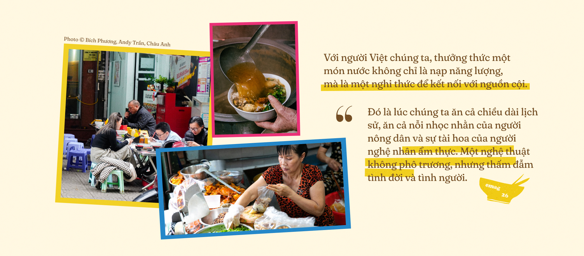 Với người Việt chúng ta, thưởng thức một món nước không chỉ là nạp năng lượng, mà là một nghi thức để kết nối với nguồn cội. Đó là lúc chúng ta ăn cả chiều dài lịch sử, ăn cả nỗi nhọc nhằn của người nông dân và sự tài hoa của người nghệ nhân ẩm thực. Một nghệ thuật không phô trương, nhưng thấm đẫm tình đời và tình người.