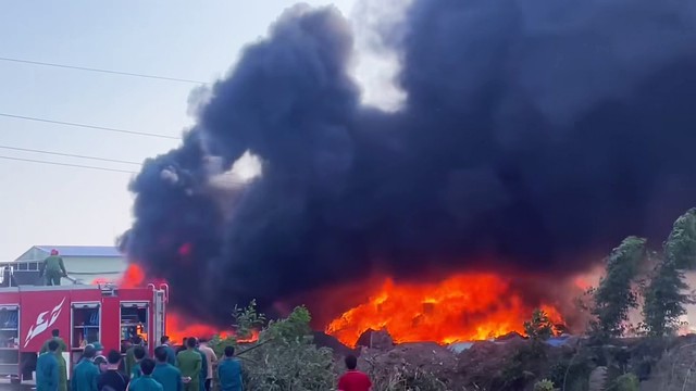 Lửa bùng phát dữ dội tại khu vực chứa bông sợi của một công ty ở phường Yên Tử, Quảng Ninh.