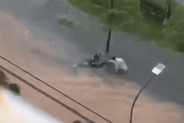Khoảnh khắc nam bảo vệ chung cư (áo mưa trắng) chạy theo kéo xe máy đang trôi theo dòng nước.