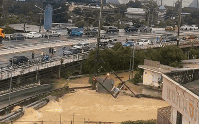 Một cột điện đã phát nổ ít nhất hai lần sau khi rơi xuống dòng nước lũ dữ dội ở trung tâm Hat Yai, tỉnh Songkhla, Thái Lan, vào thứ Bảy (ngày 22 tháng 11).