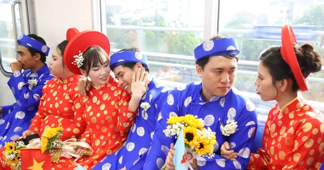 Các cặp đôi trẻ sẻ chia và lưu lại những khoảnh khắc đặc biệt trong ngày trọng đại cuộc đời mình, ngay trên chuyến tàu điện đầu tiên của thành phố.