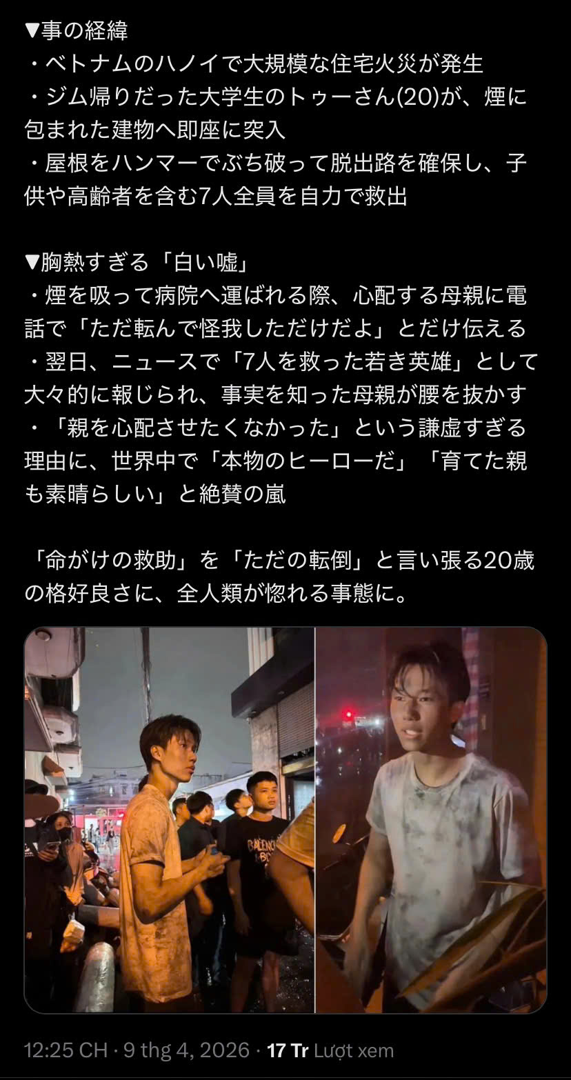 Chiều tối ngày 24/3/2026, một vụ hỏa hoạn nghiêm trọng đã xảy ra tại căn nhà 6 tầng trong ngõ 218 Lĩnh Nam (Hà Nội). Trong tình thế cấp bách khi có 7 người mắc kẹt, một nhóm người dân cùng các "người hùng" không chuyên đã kịp thời phối hợp, phá mái tôn để giải cứu các nạn nhân an toàn. Sau hơn 2 tuần, khi sự việc dần lắng xuống và các nhân vật trở lại cuộc sống thường nhật, câu chuyện về Nguyễn Lê Tú - sinh viên Khoa Vật lý Kỹ thuật, Đại học Bách khoa Hà Nội, một trong những người tham gia cứu hộ lại bất ngờ viral mạnh mẽ trên mạng xã hội X thông qua một tài khoản Nhật Bản.