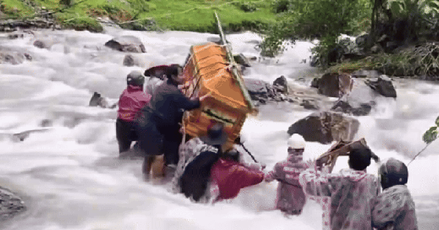 Nội dung đoạn clip cho thấy một nhóm khoảng hơn 10 người, đang cùng nhau khiêng một chiếc quan tài màu vàng qua một con suối lũ. Dòng nước đục ngầu, chảy xiết và sâu đến ngang bụng, khiến việc di chuyển trở nên vô cùng khó khăn và hiểm nguy.
