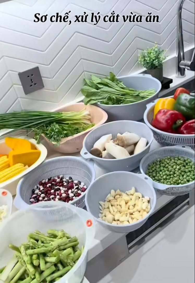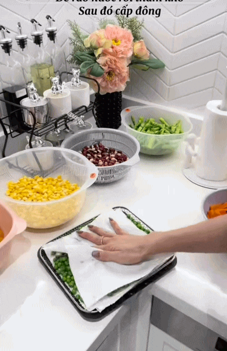 Với rau củ, Phương không chỉ đơn giản là rửa sạch rồi cho vào tủ lạnh. Cô chia sẻ rằng nếu làm đúng cách, rau củ sau khi cấp đông vẫn giữ được màu xanh đẹp mắt, không bị nhũn hay mất vị.