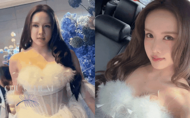 Thiều Bảo Trâm với gương mặt sưng, đơ cứng qua ống kính cam thường tại một sự kiện gần đây.