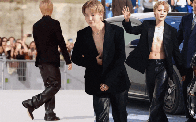 Trên hàng front row, Jimin xuất hiện với outfit mang hơi hướng unisex quen thuộc. Blazer đen phom dáng cổ điển mở toàn bộ cúc, quần da mang chút nổi loạn, lấy điểm nhấn lớn nhất là bộ trang sức mảnh - tất cả đều an toàn và "sạch sẽ". Nhưng vấn đề nằm ở tổng thể: khi bước vào thảm đỏ, set đồ ấy lại không tạo được cú chốt thị giác. Mọi thứ phẳng phiu đến mức nhạt nhòa, nếu không phải là Dior, người ta có thể nghĩ đó là một chàng trai của Saint Laurent, Balmain, Prada hay bất cứ luxury brand nào khác ngoài kia.