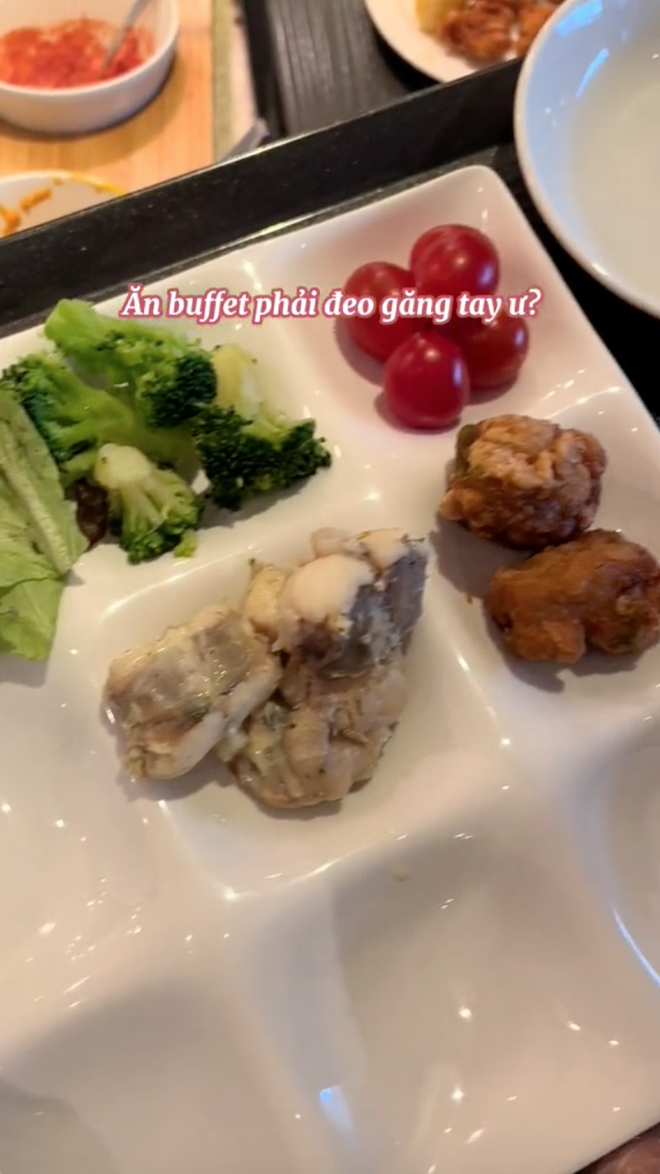 Khi đi ăn buffet mà phải đeo găng tay để bốc đồ ăn, tại nhiều hàng quán của Nhật có luôn chiếc máy giúp đeo găng hộ. Thực khách chỉ việc xỏ thẳng tay vào chiếc găng đã được căng sẵn là xong (Ảnh chụp màn hình TikTok @nhatbancogii)
