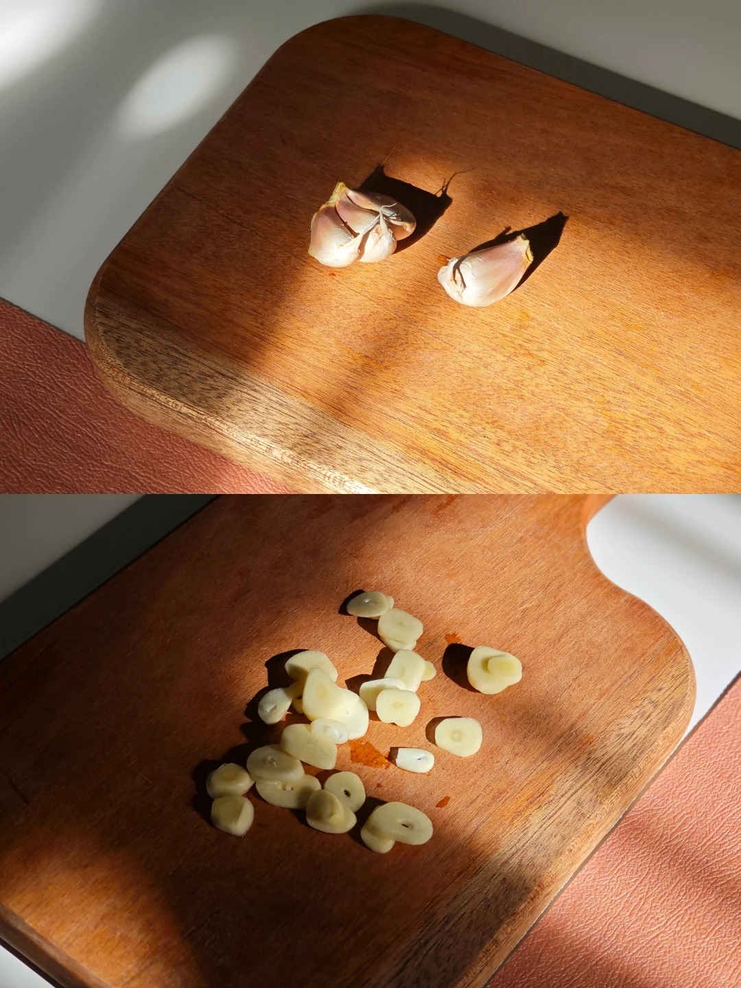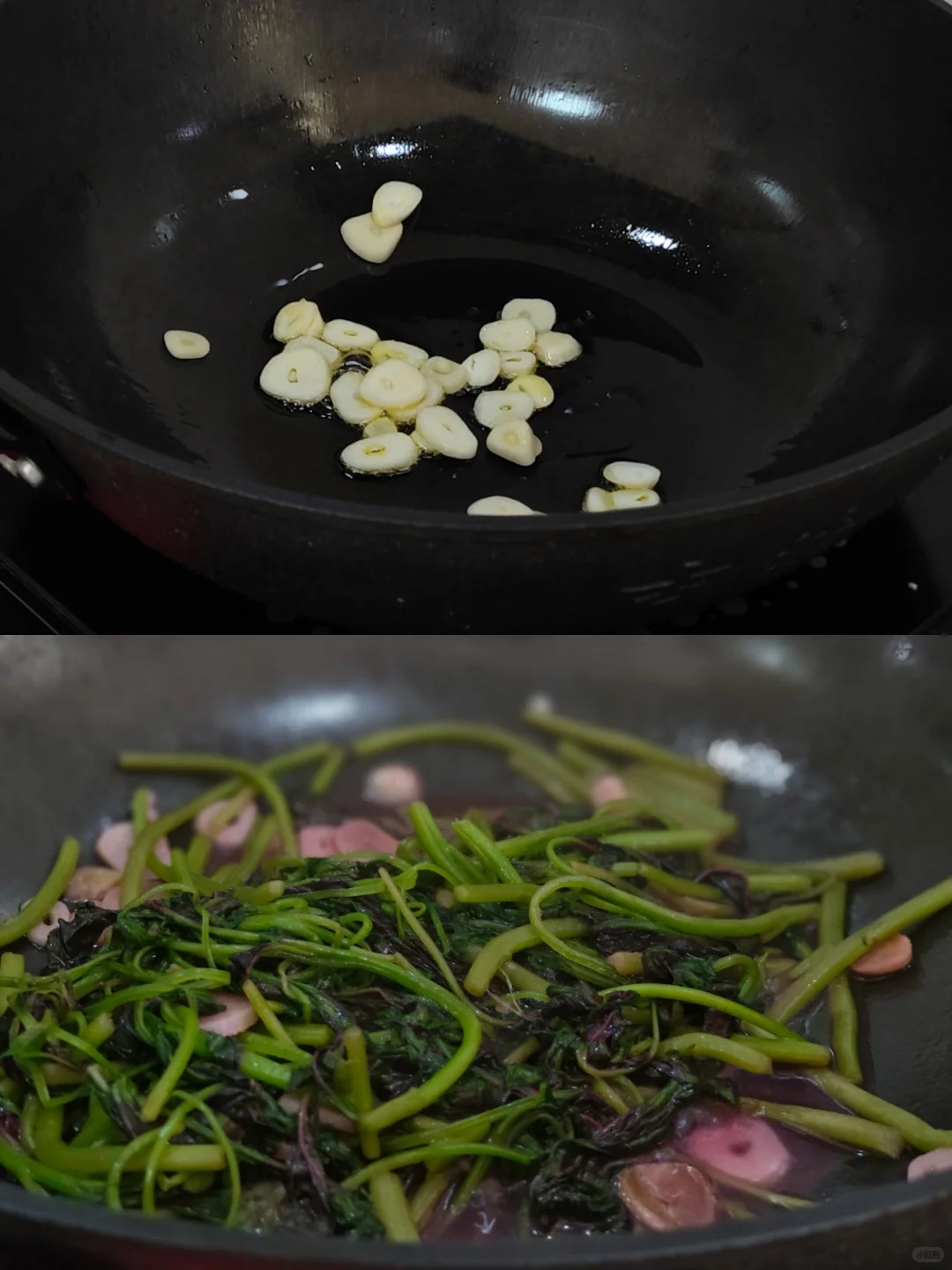 Vài tép tỏi khô được bóc vỏ, thái thành từng lát mỏng hoặc đập dập tùy theo sở thích để chuẩn bị đánh thức hương vị của món ăn. Khi chiếc chảo trên bếp đã nóng già, một chút dầu ăn được láng đều, tiếp nối là những lát tỏi được thả vào phi thơm vàng. Tiếng lèo xèo vang lên cùng hương tỏi nồng nàn lan tỏa khắp không gian bếp chính là tín hiệu hoàn hảo để trút toàn bộ phần rau vào chảo.