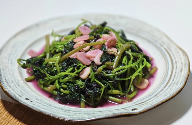 Ở bước này, nhiệt độ cần được giữ ở mức lớn để rau xanh nhanh chóng tái lại mà không bị nhũn nát hay mất đi độ giòn tự nhiên vốn có. Đôi đũa đảo đều tay liên tục, khi quan sát thấy rau bắt đầu xẹp xuống thì cho thêm một chút xíu nước lọc để om mềm, tạo điều kiện cho phần nước cốt màu hồng tía đặc trưng tiết ra hòa quyện cùng mỡ tỏi.
