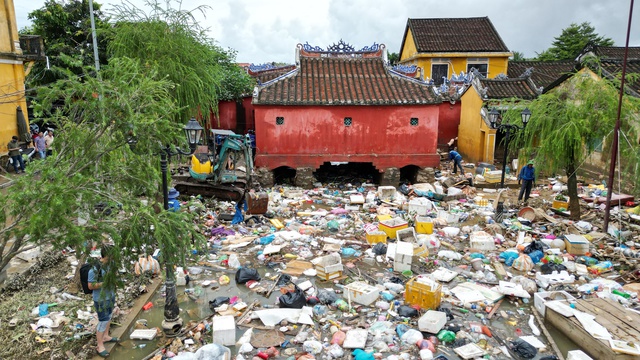 Do nằm ở cuối nguồn sông Thu Bồn nên những ngày qua, ngoài bùn đất, còn có một lượng rất lớn rác thải ùn ứ khắp nơi trong khu phố cổ.