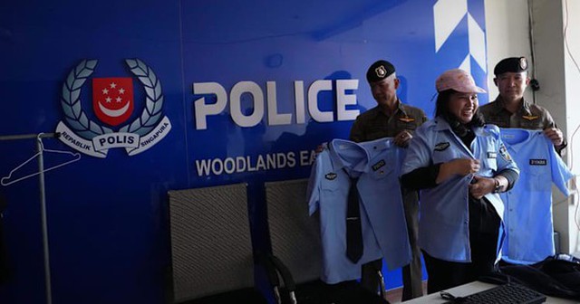 Một nhà báo Thái Lan mặc bộ đồng phục giả cảnh sát Singapore tại khu phức hợp lừa đảo ở O'Smach – Campuchia. Ảnh: AP