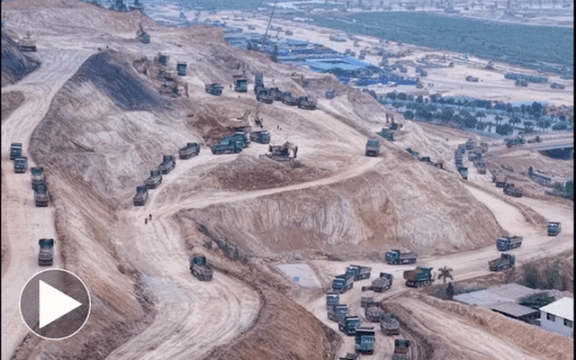 Hàng trăm xe tải, máy xúc, máy ủi và phương tiện chuyên dụng liên tục ra vào công trường, tạo nên khung cảnh như “một đàn kiến khổng lồ” đang miệt mài làm việc.