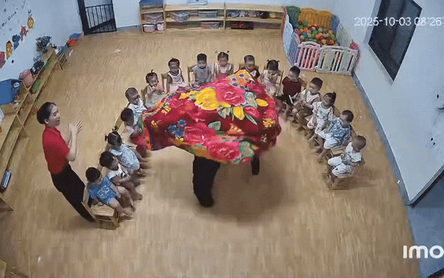 Theo đó, các cô giáo ở lớp mầm non này đã trùm chung một tấm chăn đỏ lên đầu, vừa lắc lư vừa nhún nhảy đầy nhiệt huyết, khiến khung cảnh trong lớp học rộn ràng tiếng cười. Tuy nhiên, trái ngược với tinh thần “cháy” hết mình của các cô, dàn khán giả nhí lại chỉ ngồi im, mắt tròn xoe, mặt bé nào bé nấy ngơ ngác như đang không hiểu chuyện gì đang xảy ra.