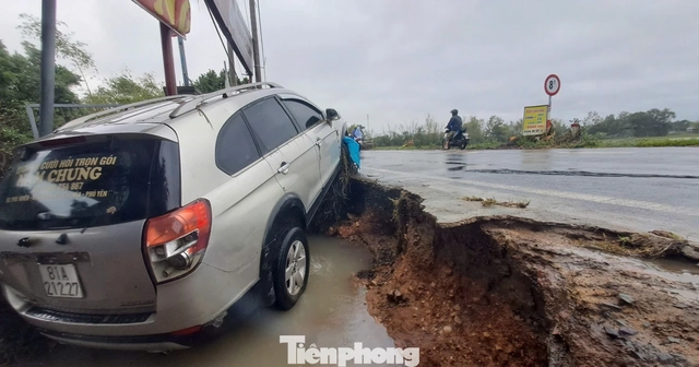 Một chiếc ô tô bên tuyến đường bị lũ đánh sạt.