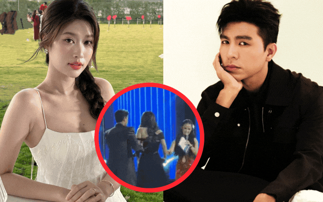 Sau khi thấy Thiên Ân vấp ngã, Steven Nguyễn không chỉ đỡ đồng nghiệp mà còn cẩn thận chỉnh lại dây váy cho cô nhưng Thiên An tỏ rõ sự bối rối, ý muốn từ chối. Nguồn: HÓNG SAO VBIZ, Chum chum.