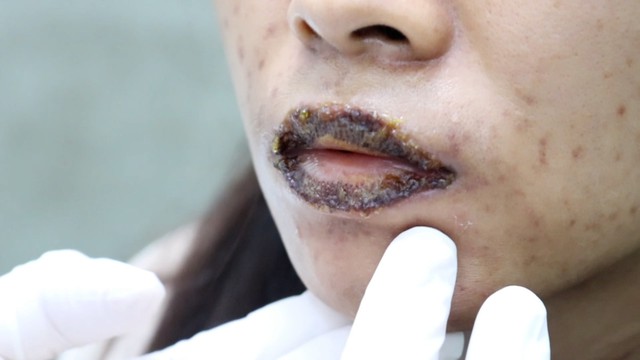 Đến ngày thứ ba, môi sưng nặng, chảy mủ nhiều, ăn uống và nói chuyện khó khăn, bệnh nhân mới đến bệnh viện. Sau khi thăm khám, các bác sĩ xác định bệnh nhân bị nhiễm trùng môi nặng, có nguy cơ hoại tử, phải điều trị tích cực.
