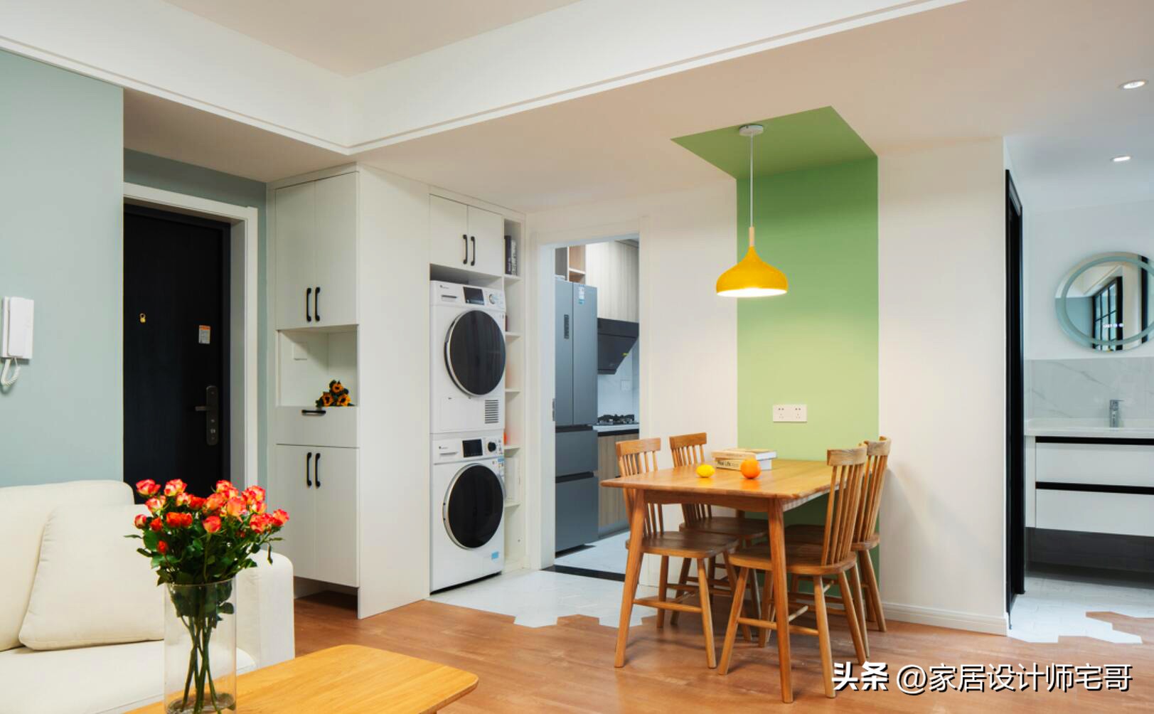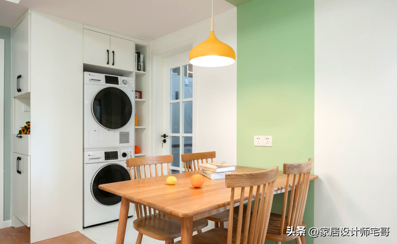 Một chi tiết đáng chú ý là khu vực đặt máy giặt và máy sấy được bố trí gọn gàng gần bếp để thuận tiện cho việc cấp thoát nước, đồng thời không làm ảnh hưởng đến thẩm mỹ chung.