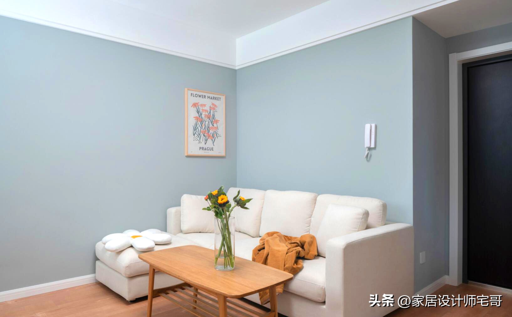 Tại phòng khách, bức tường sơn màu xanh nhạt kết hợp sofa xám giúp không gian trở nên dễ chịu và tinh tế. Việc hạn chế đồ trang trí cũng giúp căn phòng trông rộng hơn thực tế.