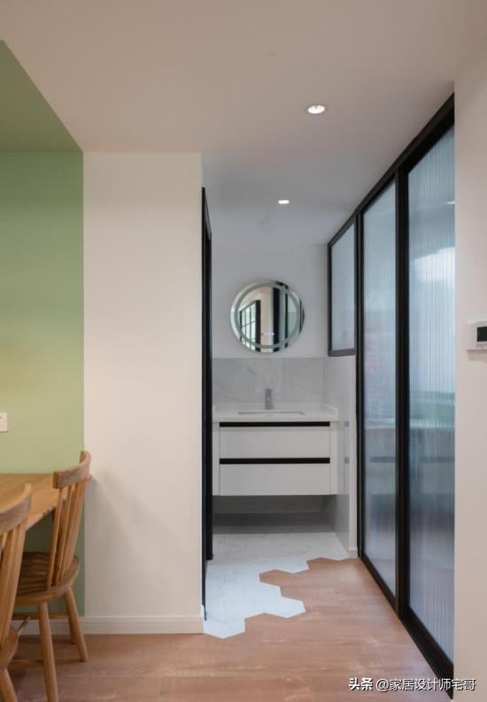 Nhà thiết kế đã tinh chỉnh diện tích phòng tắm, thu gọn khu vực tắm để tạo thêm diện tích cho khu ăn uống và bố trí phòng học cho trẻ. Nhờ vậy, căn hộ có thêm một phòng chức năng mới mà tổng thể vẫn hài hòa.
