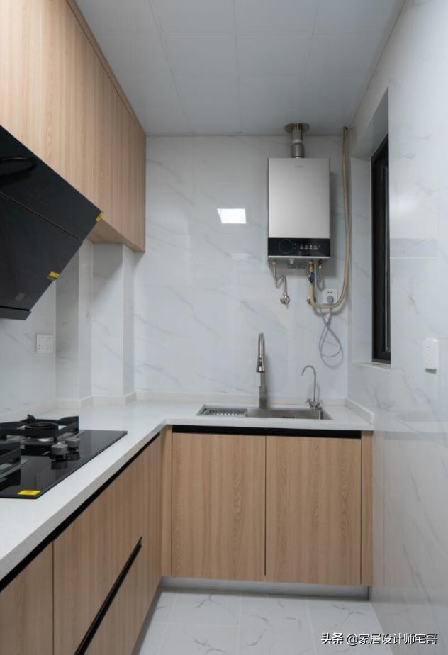 Khu bếp được bố trí theo dạng chữ L, phù hợp với không gian không quá rộng nhưng vẫn đảm bảo đủ khu vực chuẩn bị và nấu nướng.