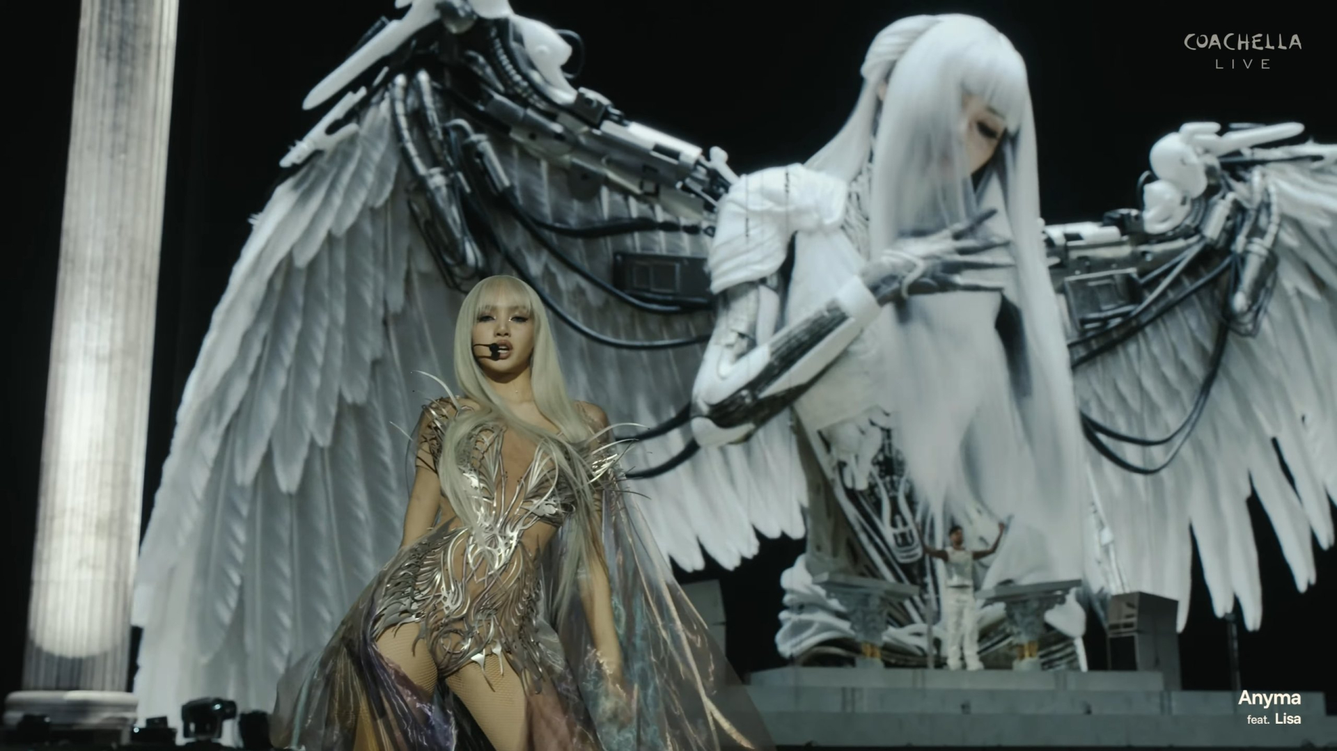 Khoảnh khắc Lisa bước lên từ dưới sân khấu để lần đầu biểu diễn live Bad Angel (phát hành ngày 09/04/2026) được xem là một trong những màn cameo ấn tượng nhất lịch sử lễ hội. Toàn bộ phần trình diễn được đặt trong hệ thống visual 3D đặc trưng của Anyma, nơi Lisa hóa thân thành “thiên thần cyborg” siêu thực. Bộ outfit Cyber Y2K táo bạo từ đẩy hình tượng này lên cao trào, mái tóc trắng, thần thái sắc lạnh và body được tôn lên như tượng tạc. Ngay sau sân khấu, từ khóa liên quan đến Lisa leo thẳng top 1 tìm kiếm toàn cầu.