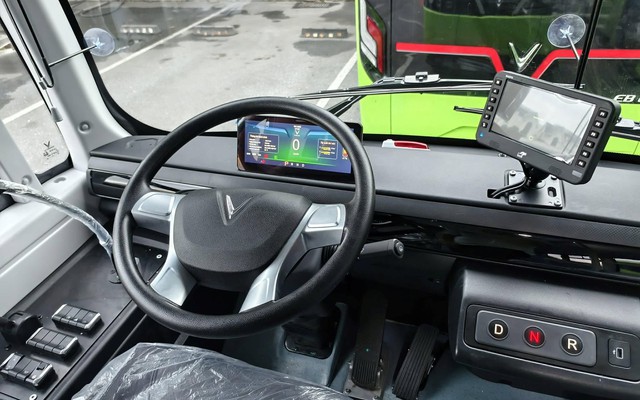Ở góc ảnh này, có thể thấy xe trang bị máy điểm danh (góc dưới bên trái), có ngăn đựng đồ cứu thương và màn hình tivi (góc trên bên trái). Ngoài các trang bị này, công bố của VinFast trước đây cho biết xe chở học sinh còn có camera giám sát tài xế, máy lọc không khí, cảm biến chất lượng không khí, cảnh báo bỏ quên học sinh, ứng dụng kết nối phụ huynh.