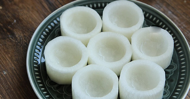 2. Củ cải trắng gọt vỏ, rửa sạch, cắt thành những khúc có độ dày bằng nhau. Có thể dùng khuôn để tạo hình cho củ cải thêm đẹp mắt như hình bông hoa mai hoặc hình dạng khác tùy thích. Sau đó, dùng thìa nhỏ khoét một lỗ tròn ở giữa miếng củ cải, lưu ý không khoét xuyên qua đáy để tránh thịt bị lọt ra ngoài.