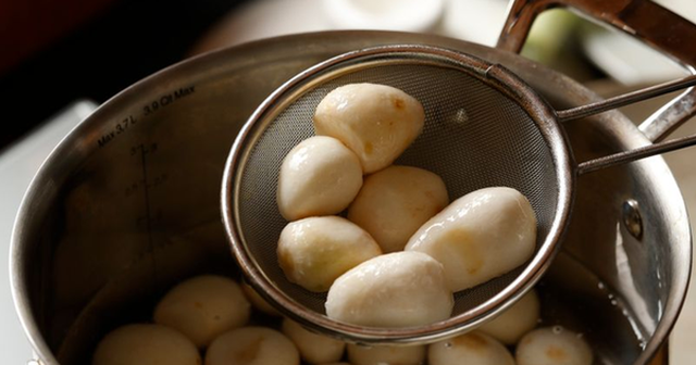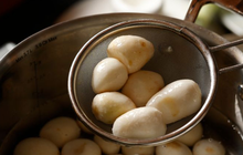 Chuẩn bị 1 kg khoai sọ củ già để đảm bảo khoai không bị sượng, bị nước, rửa sạch và bỏ vào nồi luộc chín rồi vớt ra để nguội và lột sạch vỏ.