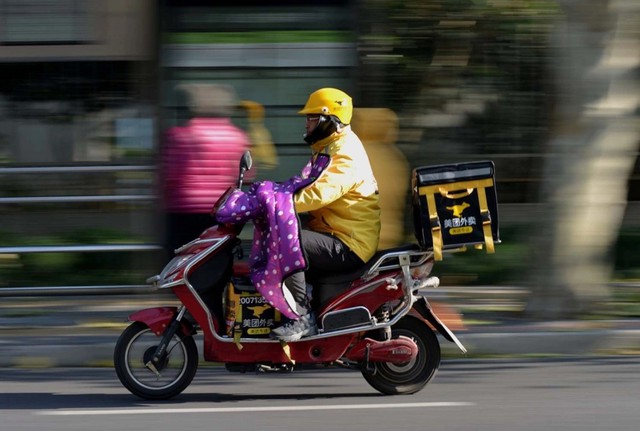 Một nhân viên giao hàng trên đường phố Thượng Hải, Trung Quốc