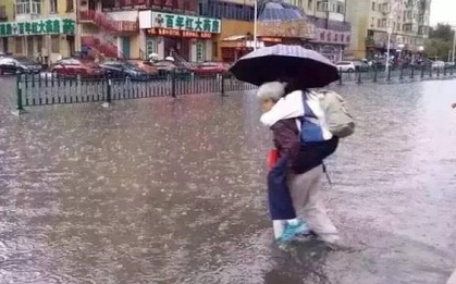 Vì sợ anh chàng người yêu bị ướt đôi giày da bóng lộn dưới chân, một cô gái trẻ ở Vũ Hán, Hồ Bắc, Trung Quốc đã kiên quyết cõng chàng rồi lội nước băng qua đường, thu hút sự chú ý rất lớn của dư luận nước này.