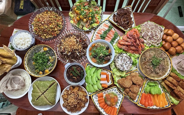 Đếm sơ sơ, mâm cơm đã có tới 22 món. Những món quen thuộc của ngày Tết như bánh chưng xanh, gà luộc vàng óng, nem rán giòn rụm, cá kho đậm đà, các món rau củ luộc, món xào thập cẩm… đều có mặt đầy đủ. Chỉ riêng việc hoàn thành trọn vẹn từng ấy món trong một buổi sáng đã là điều không hề đơn giản.