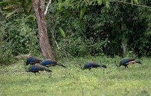 Mâm cơm nhà gồm tràng lợn luộc, cá kho, ngọn bắp cải luộc, cơm gạo lứt, dưa gang tráng miệng.