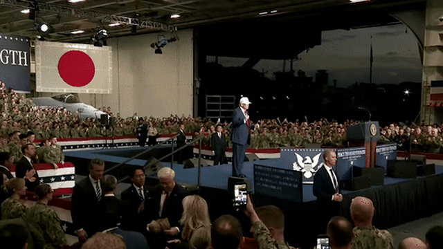 Theo Guardian, BBC Culture, ABCTrong chặng dừng chân thứ hai của chuyến công du châu Á, Tổng thống Mỹ Donald Trump đã tới thăm Căn cứ Hải quân Yokosuka và có bài phát biểu trước 6.000 binh lính Mỹ trên tàu sân bay USS George Washington.