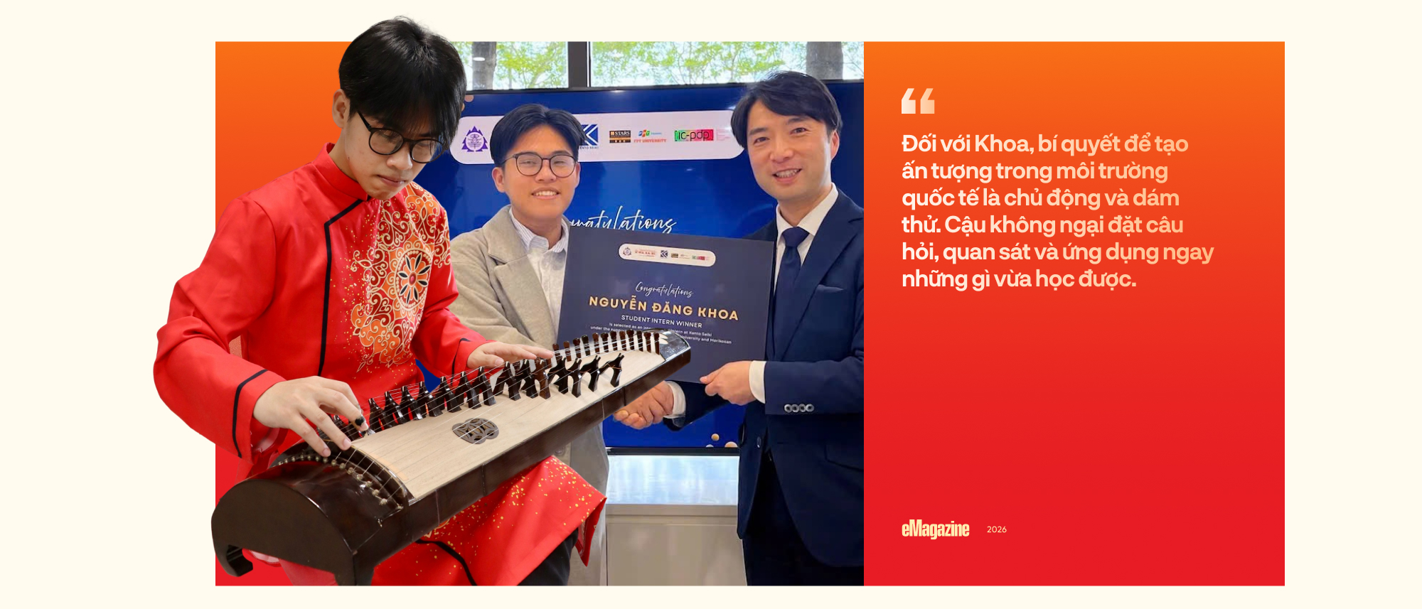 Đối với Khoa, bí quyết để tạo ấn tượng trong môi trường quốc tế là chủ động và dám thử. Cậu không ngại đặt câu hỏi, quan sát và ứng dụng ngay những gì vừa học được. Bên cạnh đó, những "bản sắc" Việt Nam mang trên mình cũng giúp Khoa có dấu ấn riêng. "Ở FPTU, các thầy cô thường có câu nói: "Bước ra toàn cầu trong tim có tiếng đàn bầu". Đấy là bản sắc Việt, là võ Vovinam, là nhạc cụ dân tộc mà sinh viên FPTU nào cũng được học". Khi Khoa "khoe" những nét bản sắc này với các anh chị trong công ty, mọi người đều mến mộ.