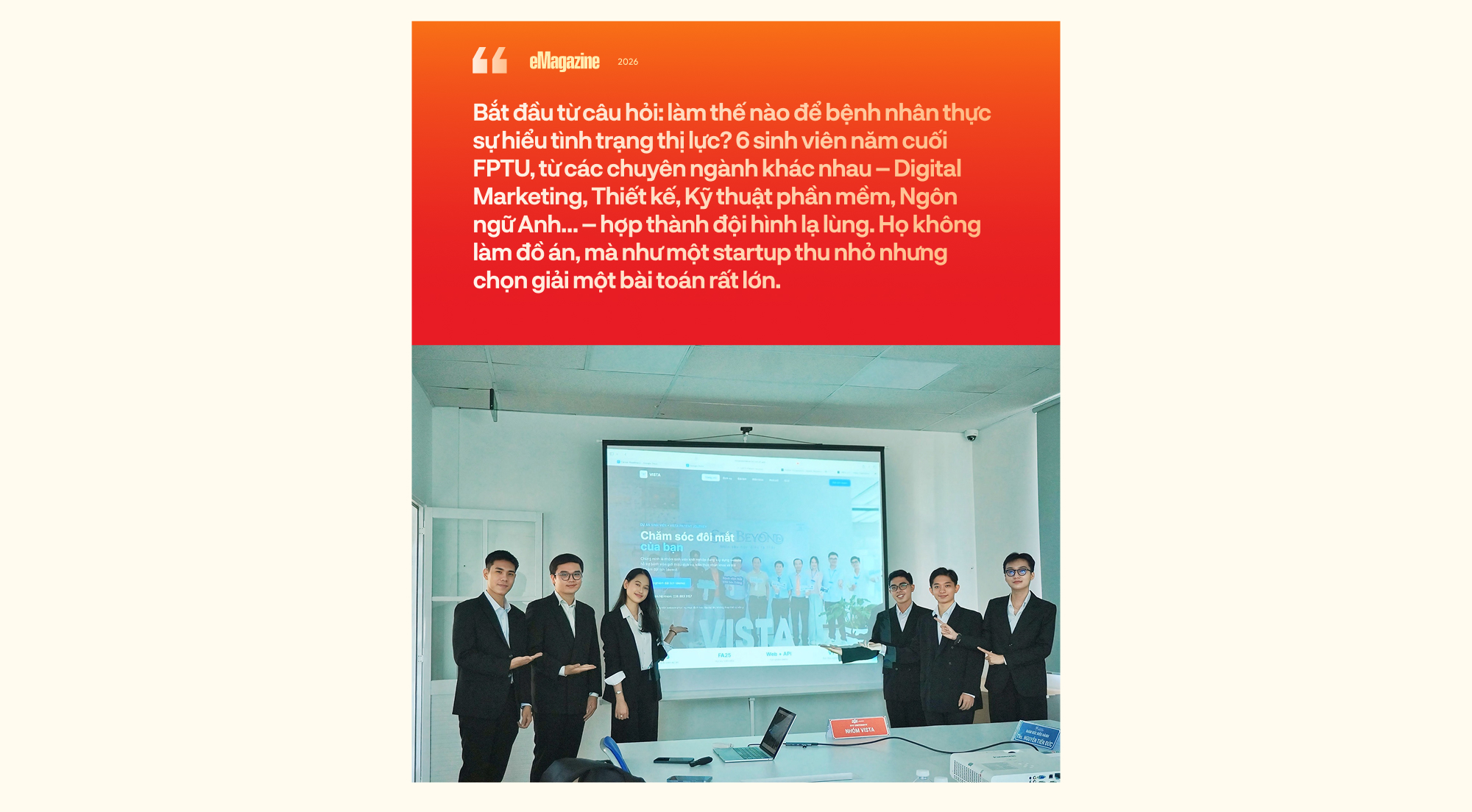 Bắt đầu từ câu hỏi: làm thế nào để bệnh nhân thực sự hiểu tình trạng thị lực? 6 sinh viên năm cuối FPTU, từ các chuyên ngành khác nhau – Digital Marketing, Thiết kế, Kỹ thuật phần mềm, Ngôn ngữ Anh… – hợp thành đội hình lạ lùng. Họ không làm đồ án, mà như một startup thu nhỏ nhưng chọn giải một bài toán rất lớn.