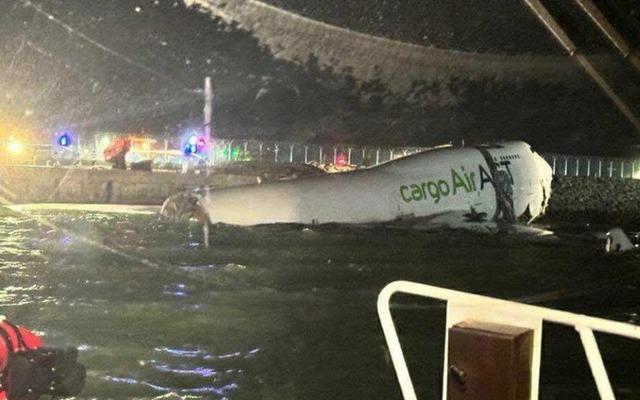 Máy bay trượt khỏi đường băng lao xuống biển ở Hong Kong. (Ảnh: Twitter)